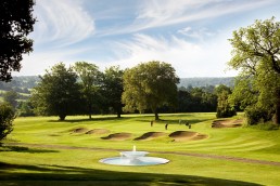 A memorable par 3 over a 300-year old fountain to a green guarded by seven bunkers.